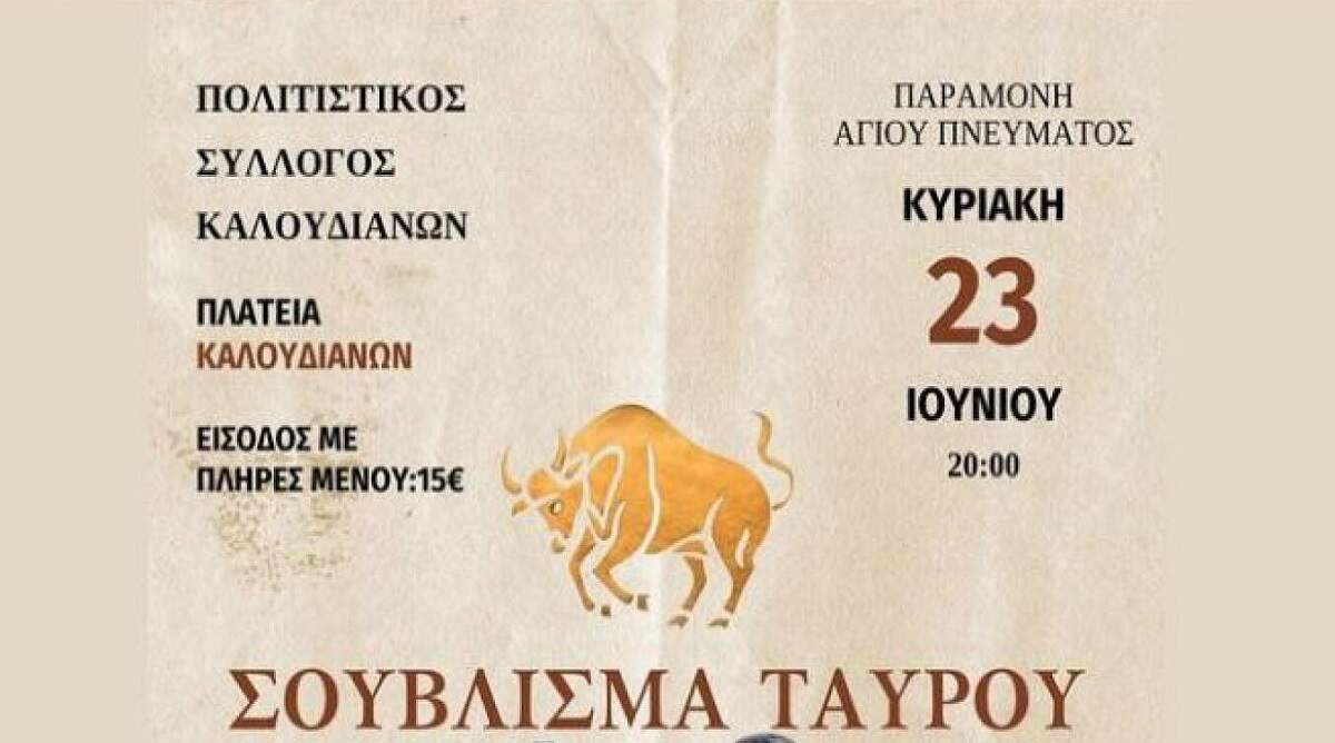 Η ενέργεια πολιτιστικού συλλόγου στην Κρήτη να εντάξει το σούβλισμα ταύρου σε πανηγύρι την Κυριακή, παραμονή της πεντηκοστής και της εορτής του Αγίου Πνεύματος αλλά και να δημοσιεύσει και σχετική αφίσα που διαφήμιζε είσοδο με «πλήρες μενού» και σούβλισμα ταύρου αντί 15 ευρών, προκάλεσε αμέτρητα σχόλια κάτω από τη σχετική ανάρτηση. Παρά τις αντιδράσεις πολιτών αλλά και φιλοζωικών οργανώσεων ο 215 κιλών ταύρων σουβλίστηκε στα Καλουδιανα Κισσάμου.