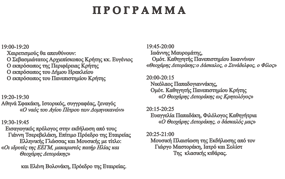Η Εταιρεία Ελληνικής Γλώσσας και Μουσικής διοργανώνει εκδήλωση στη μνήμη του Θεοχάρη Δετοράκη, Ομότιμου Καθηγητή του Πανεπιστημίου Κρήτης, υπό την Αιγίδα της Περιφέρειας Κρήτης.