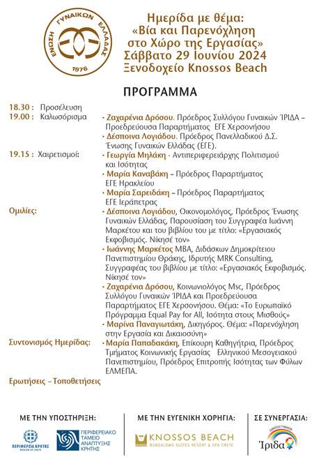 Η Ένωση Γυναικών Ελλάδας (ΕΓΕ) στις 29 Ιουνίου ημέρα Σάββατο και ώρα 18.30 , στο KNOSSOS BEACH (Κοκκίνη Χάνι), διοργανώνει Ημερίδα με θέμα “Βία και Παρενόχληση στο Χώρο της Εργασίας”. Η Ημερίδα πραγματοποιείται με την Υποστήριξη της Περιφέρειας Κρήτης και για το λόγο αυτό η Ένωση Γυναικών Ελλάδας ευχαριστεί τον Περιφερειάρχη Κρήτης κ. Σταύρο Αρναουτάκη και την Αντιπεριφερειάρχη Πολιτισμού και Ισότητας κ. Γεωργία Μηλάκη. Η Hμερίδα διοργανώνεται σε συνεργασία με το Σύλλογο Γυναικών ΊΡΙΔΑ και την ευγενική χορηγία του Ξενοδοχείου KNOSSOS BEACH.