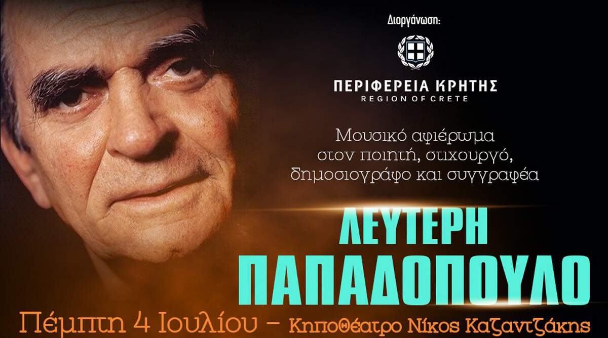 Ο Γιώργος Χιντηράκης επιμελείται και παρουσιάζει ένα μουσικό αφιέρωμα στον κορυφαίο ποιητή, στιχουργό, δημοσιογράφο και συγγραφέα Λευτέρη Παπαδόπουλο, με τη συμμετοχή της Ελένης Δήμου, σε μια συναυλία που γίνεται με την διοργάνωση της Περιφέρειας Κρήτης, την Πέμπτη 4 Ιουλίου στις 21:00, στο κηποθέατρο Νίκος Καζαντζάκης.