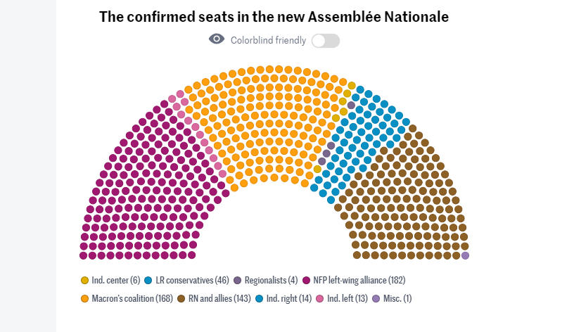 Όσο για την νέα Εθνοσυνέλευση εμφανίζεται να έχει τέσσερις βασικούς πολιτικούς σχηματισμούς. Αναλυτικότερα και με βάση τα τελικά αποτελέσματα το Νέο Λαϊκό Μέτωπο της Αριστεράς εξέλεξε 182 βουλευτές, η προεδρική παράταξη του Μακρόν 168 βουλευτές, ο ακροδεξιός Εθνικός Συναγερμός της Μαρίν Λεπέν 143 βουλευτές και οι Ρεπουμπλικάνοι 68 βουλευτές. Σε αυτούς θα πρέπει να προστεθούν 14 ανεξάρτητοι βουλευτές προσκείμενοι στην δεξιά, 13 προσκείμενοι στην αριστερά, 6 κεντρώοι και 5 βουλευτές περιφερειακών συμφερόντων.