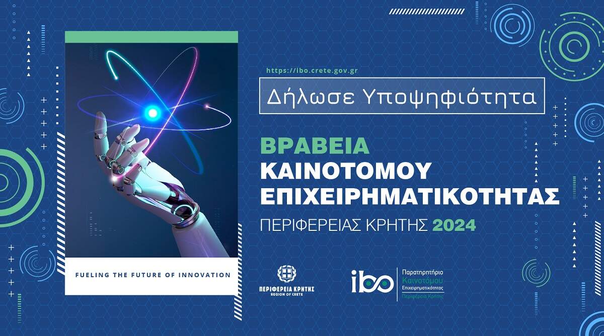 Η Περιφέρεια Κρήτης καλεί κρητικές επιχειρήσεις (με δηλωμένη έδρα στην Περιφέρεια Κρήτης) οι οποίες έχουν αναπτύξει καινοτόμα προϊόντα, υπηρεσίες ή διαδικασίες, να δηλώσουν συμμετοχή για τα Βραβεία Καινοτόμου Επιχειρηματικότητας 2024 της Περιφέρειας Κρήτης, τα οποία έχουν θεσμοθετηθεί και απονέμονται για 2η χρονιά.