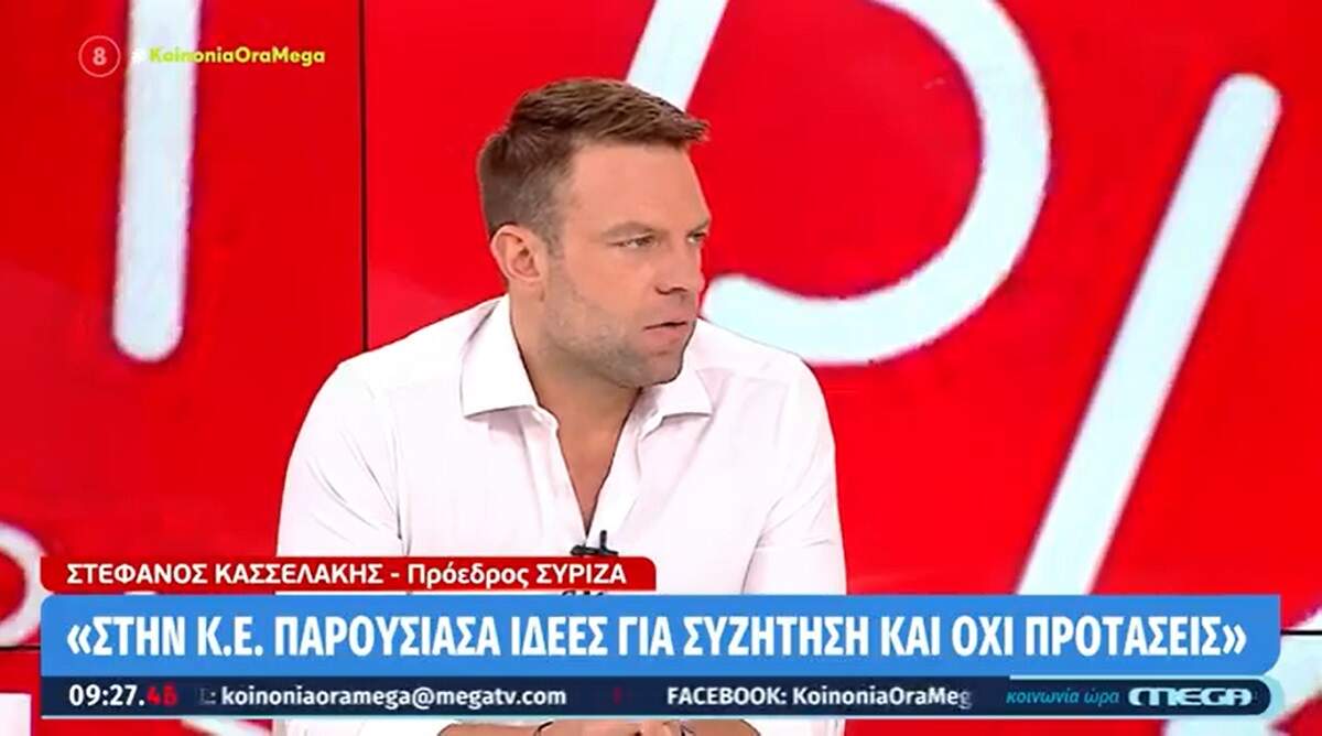 Ησύγκλιση στην κεντροαριστερά είναι πολύ σημαντική αλλά πρέπει να γίνει σταδιακά και στη βάση προγραμμάτων τόνισε ο Στέφανος Κασσελάκης σε συνέντευξη που παραχώρησε στο Mega και στους δημοσιογράφους Ιορδάνη Χασαπόπουλο και Ανθή Βούλγαρη. Ο πρόεδρος του ΣΥΡΙΖΑ – ΠΣ υπογράμμισε ότι «είναι κρίσιμες οι αποφάσεις που πρέπει να πάρουμε από εδώ και πέρα και όλοι πρέπει να είμαστε προ των ευθυνών μας», τονίζοντας ότι τα όργανα του κόμματος θα συνεχίζουν να συνεδριάζουν ακόμα πιο συχνά, και μέσα στον Αύγουστο.