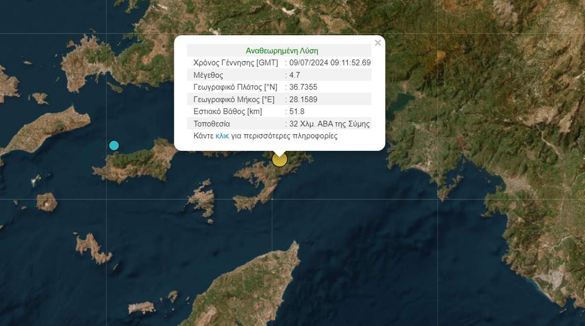 Σεισμός 4,7 Ρίχτερ σημειώθηκε πριν από λίγο ανοιχτά της Σύμης.