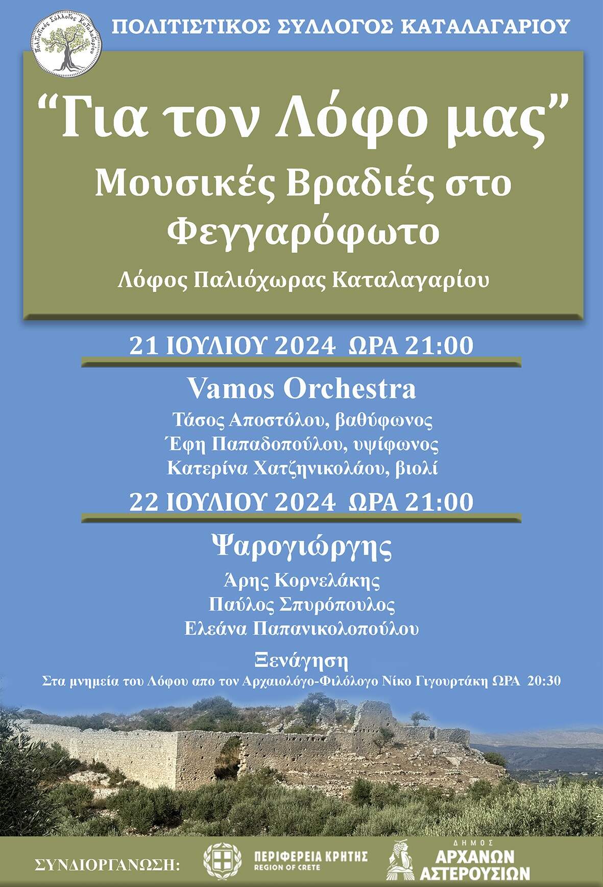 Την Κυριακή 21 Ιουλίου και ώρα 21:00 η Vamos Orchestra, υπό την διεύθυνση του Θανάση Παπαθανασίου, συμπράττει για πρώτη φορά με την διακεκριμένη βιολονίστα Κατερίνα Χατζηνικολάου, εξάρχουσα της Κρατικής Ορχήστρας Αθηνών, σε μια συναυλία κάτω από τον ανοιχτό ουρανό, την βραδιά της Πανσελήνου του Κόκκινου Ελαφιού, στον λόφο της Παλιόχωρας Καταλαγαρίου του Δήμου Αρχανών – Αστερουσίων. Μαζί τους ερμηνεύουν φωνητικά η υψίφωνος Έφη Παπαδοπούλου και ο βαθύφωνος της Λυρικής σκηνής Τάσος Αποστόλου.