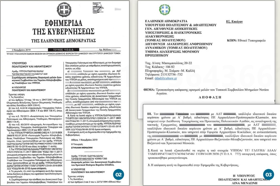 Με υπογραφή Λίνας Μενδώνη οι κατηγορούμενοι για τη σπείρα εκβιασμού καταστηματαρχών Γ. και Α. διορίζονται μέλη του ΔΣ του Ταμείου Αλληλοβοήθειας. Η απόφαση της Λ. Μενδώνη με την οποία ο Γ. τοποθετείται στο Τοπικό Συμβούλιο Μνημείων Ν. Αιγαίου