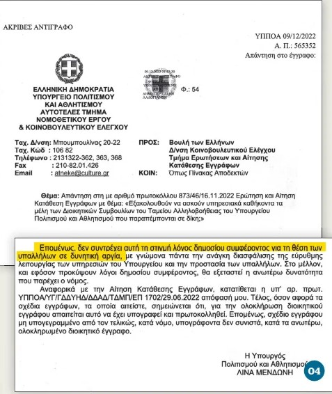 Σε κοινοβουλευτική ερώτηση η υπουργός Πολιτισμού απαντά ότι δεν συντρέχει λόγος δημόσιου συμφέροντος ώστε να θέσει σε εργία τους κατυηγορούμενους για τις υποθέσεις του Ταμείου Αλληλοβοήθειας