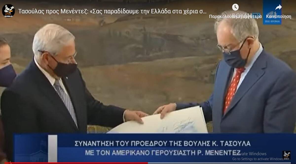 Αυτή τη δουλική δήλωση, αντίστοιχη με την οποία είχε κάνει ο Τσολάκογλου στους ναζί και η Φρειδερίκη στον Αμερικανό πρέσβη, είχε διατυπώσει ο πρόεδρος της ελληνικής (;) βουλής, Κώστας Τασούλας το 2021 κατά την επίσκεψη του Προέδρου της Επιτροπής Εξωτερικών Σχέσεων της Γερουσίας των ΗΠΑ, Μπομπ Μενέντεζ…