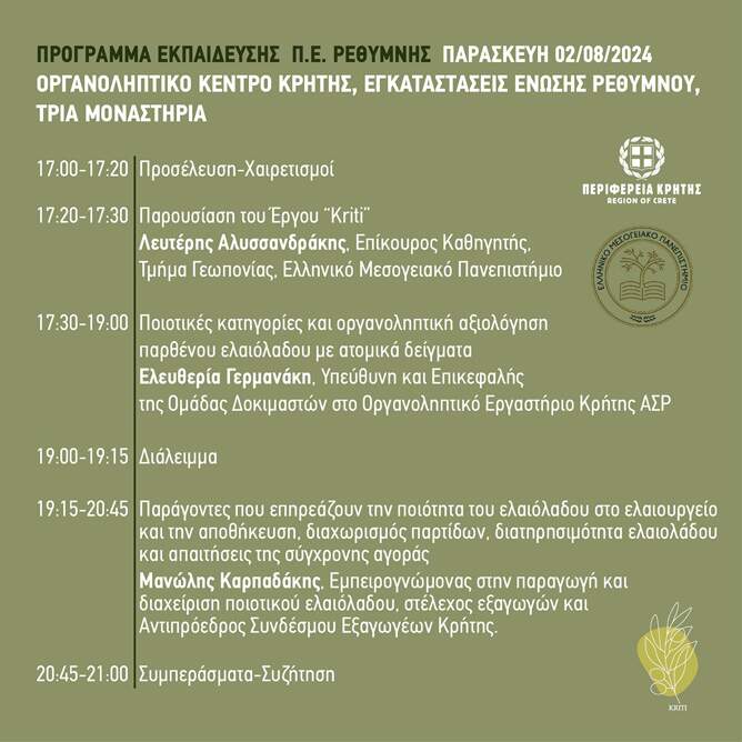 Η Περιφέρεια Κρήτης και το Ελληνικό Μεσογειακό Πανεπιστήμιο, σε συνεργασία με το Δήμο Ρεθύμνου, διοργανώνουν εσπερίδα με τίτλο «Οργανοληπτική αξιολόγηση του Εξαιρετικού Παρθένου Ελαιόλαδου “Kriti” και οι παράγοντες που την επηρεάζουν», η οποία θα πραγματοποιηθεί την Παρασκευή 2 Αυγούστου 2024, στις 17:00 μ.μ., στο Οργανοληπτικό Εργαστήριο Κρήτης στις εγκαταστάσεις της Ένωσης Ρεθύμνου στα Τρία Μοναστήρια. Την εκδήλωση υποστηρίζουν οι: Σύνδεσμος Εξαγωγέων Κρήτης, Σύνδεσμος Τυποποιητών Ελαιολάδου Κρήτης, Σύνδεσμος Ελαιοκομικών Δήμων Κρήτης, Δίκτυο Κρητικού Ελαιολάδου, Σύνδεσμος Ελαιουργών Ν. Ηρακλείου.