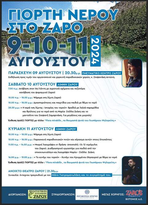 Ο Πολιτιστικός Σύλλογος Ζαρού σε συνδιοργάνωση με την Περιφέρεια Κρήτης, στο πλαίσιο των καλοκαιρινών εκδηλώσεων του Ζαρού διοργανώνει για δεύτερη συνεχόμενη χρονιά τη «Γιορτή Νερού» στις 9, 10 & 11 Αυγούστου 2024. Το πρόγραμμα του τριημέρου έχει διαμορφωθεί ως εξής: