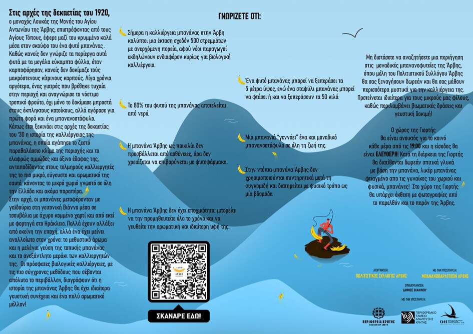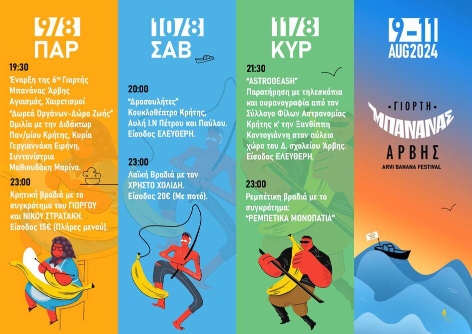 Ο Πολιτιστικός Σύλλογος Άρβης διοργανώνει την 6η Γιορτή Μπανάνας Άρβης στις 9-10-11 Αυγούστου 2024 με την υποστήριξη της Περιφέρειας Κρήτης , του Δήμου Βιάννου και του Οργανισμού Λιμένος Ηρακλείου.