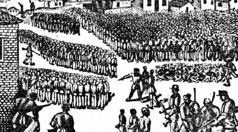 Γύρω στις 8.00 π.μ. η πλατεία της Οσίας Ξένης, αλλά και οι γύρω δρόμοι, έχουν γεμίσει από κόσμο. Περίπου 25.000 άτομα. Χωρίζονται κατά ομάδες σε πεντάδες με κενά μεταξύ τους για να μπορούν οι δήμιοι και να υποδεικνύουν όποιον θέλουν. Η εντολή είναι να κάθονται γονατιστοί με ψηλά το κεφάλι. Η ζέστη αφόρητη και αρκετοί είναι αυτοί που λιποθυμούν και ζητούν εναγωνίως λίγες σταγόνες νερό. Όσες γυναίκες προσπαθούν να πλησιάσουν τους κρατούμενους προσφέροντάς τους από τις πήλινες στάμνες λίγο νερό, κακοποιούνται μπροστά σε όλους. Οι γερμανοτσολιάδες πιάνουν δουλειά.