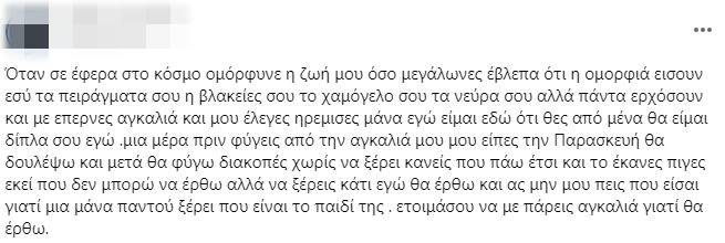 “Όταν σε έφερα στο κόσμο ομόρφυνε η ζωή μου, όσο μεγάλωνες έβλεπα ότι η ομορφιά ήσουν εσύ τα πειράγματα σου, οι βλακείες σου, το χαμόγελο σου, τα νεύρα σου αλλά πάντα ερχόσουν και με έπαιρνες αγκαλιά και μου έλεγες ηρέμησε μάνα εγώ είμαι εδώ ότι θες από μένα θα είμαι δίπλα σου εγώ. Μια μέρα πριν φύγεις από την αγκαλιά μου μου είπες την Παρασκευή θα δουλέψω και μετά θα φύγω διακοπές χωρίς να ξέρει κανείς που πάω έτσι και το έκανες πήγες εκεί που δεν μπορώ να έρθω αλλά να ξέρεις κάτι, εγώ θα έρθω και ας μην μου πεις που είσαι γιατί μια μάνα παντού ξέρει που είναι το παιδί της. Ετοιμάσου να με πάρεις αγκαλιά γιατί θα έρθω…”