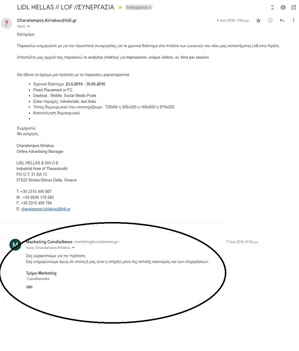 Στηρίξαμε και στηρίζουμε την τοπική κοινωνία και την αγορά της, αλλά εμείς από αυτή την αγορά είμαστε από την αρχή αποκλεισμένοι. Για παράδειγμα, όταν πριν μερικά χρόνια κάναμε σειρά αποκαλύψεων για τις πολεοδομικές και άλλες παρανομίες του μεγαθήριου της Lidl στην περιοχή της Νέας Αλικαρνασσού, δεχτήκαμε την “πρόταση” της εταιρείας για διαφημιστικά πακέτα. Απαντήσαμε “ευχαριστούμε, δε θα πάρουμε, εμείς στηρίζουμε την τοπική αγορά”. (δείτε τα ντοκουμέντα παρακάτω).