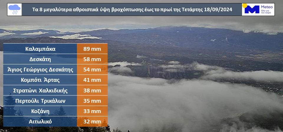 Την ίδια ώρα, από τις πρώτες πρωινές ώρες της Τετάρτης (18/9) σημειώνονται βροχές και τοπικές καταιγίδες σε μεγάλο τμήμα της χώρας. Οι μετεωρολογικοί σταθμοί του Εθνικού Αστεροσκοπείου Αθηνών έχουν καταγράψει σημαντικά ύψη βροχής, με το μεγαλύτερο ύψος να καταγράφεται στην Καλαμπάκα με 89 mm.