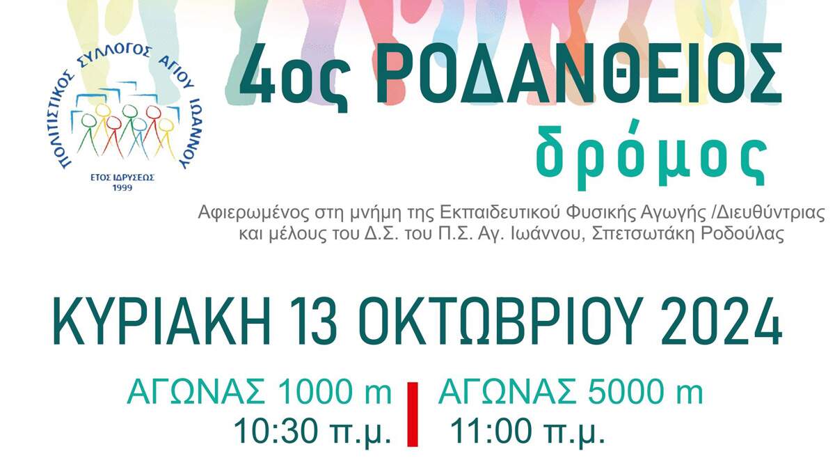 Ο Πολιτιστικός Σύλλογος Αγίου Ιωάννου με τη στήριξη της Περιφέρειας Κρήτης διοργανώνει τον «4ο Ροδάνθειο Δρόμο 2024» με διαδρομή περιφερειακά του προαστίου του Αγίου Ιωάννου Ηρακλείου στη μνήμη της Εκπαιδευτικού/Διευθύντριας Φυσικής Αγωγής και μέλος του Δ.Σ. του Συλλόγου Ροδούλας Σπετσωτάκη την Κυριακή 13 Οκτωβρίου 2024.