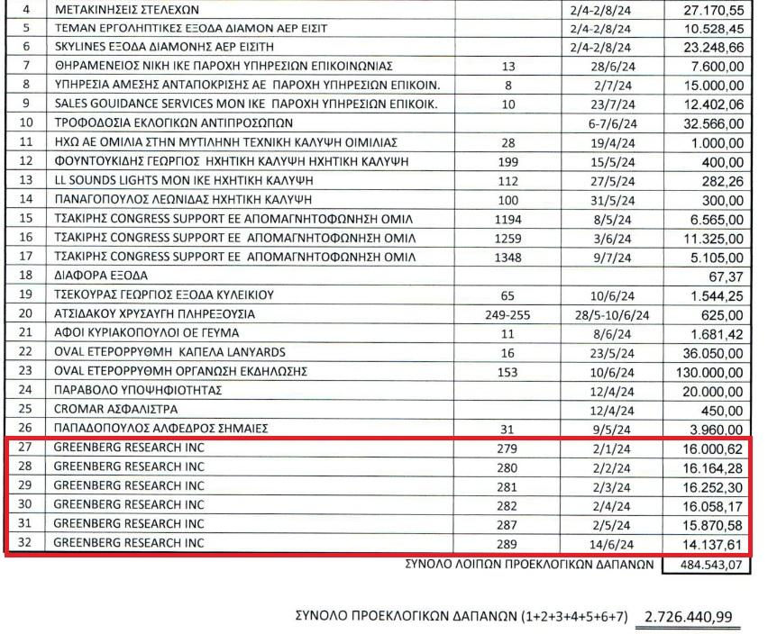 Συγκεκριμένα, ο γνωστός επικοινωνιολόγος λάμβανε 16.000 το μήνα για να παρέχει συμβουλές στον Κυριάκο Μητσοτάκη. Όπως φαίνεται από την ειδική έκθεση εσόδων δαπανών των πρόσφατων ευρωεκλογών, η ΝΔ έδωσε στον Σταν Γκρίνμπεργκ 94.483,56 ευρώ από τον Ιανουάριο του 2024 έως τον Ιούνιο του 2024. Πρόκειται για έξι διαφορετικές συμβάσεις από 14.137,61 ευρώ (τον «κουτσουρεμένο» μήνα των ευρωεκλογών καθώς οι κάλπες στήθηκαν 9 του μήνα) έως 16.252,30 ευρώ.