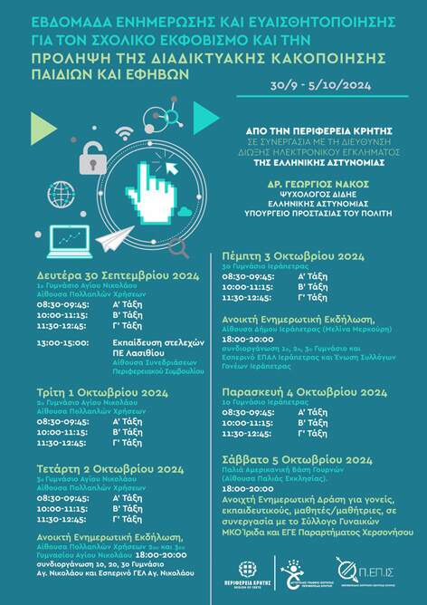 Το Αυτοτελές Γραφείο Ισότητας της Περιφέρειας Κρήτης, στο πλαίσιο του «Περιφερειακού Σχεδίου Δράσης Κρήτης για την Ισότητα των Φύλων 2023-2025», συνεχίζουν τη συνεργασία με τη Διεύθυνση Δίωξης Ηλεκτρονικού Εγκλήματος της Ελληνικής Αστυνομίας, πραγματοποιώντας τον 4ο Κύκλο Ενημερωτικών Δράσεων για την «Ασφαλή Πλοήγηση στο Διαδίκτυο, τους Διαδικτυακούς Κινδύνους και τις Πρακτικές Αντιμετώπισής τους», από τη Δευτέρα 30 Σεπτεμβρίου έως και το Σάββατο 5 Οκτωβρίου 2024.