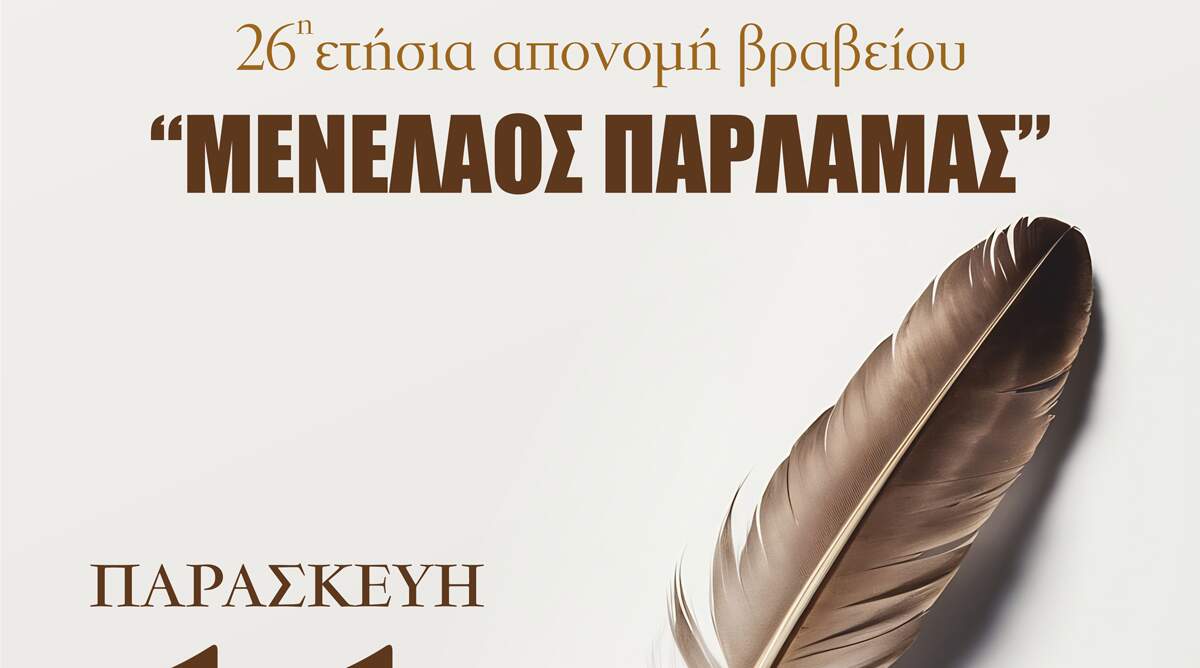 Ο Δήμος Χερσονήσου και ο Σύλλογος «Φίλοι του Πανεπιστημίου Κρήτης» σε συνεργασία με την Φιλοσοφική Σχολή του Πανεπιστημίου Κρήτης, οργανώνουν την 26η ετήσια απονομή του βραβείου εις μνήμην ΜΕΝΕΛΑΟΥ ΠΑΡΛΑΜΑ, την Παρασκευή 11 Οκτωβρίου και ώρα 19:00, στην αίθουσα της Βικελαίας Δημοτικής Βιβλιοθήκης (2ος όροφος). Την Πέμπτη 10 Οκτωβρίου, θα τελεστεί τρισάγιο στον οικογενειακό τάφο του εκλιπόντα στο Πισκοπιανό.