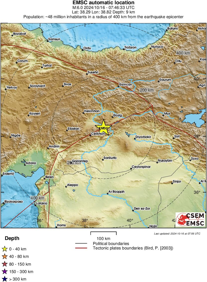 Σύμφωνα με τα πρώτα στοιχεία του Ευρωμεσογειακού Σεισμολογικού Κέντρου, το επίκεντρο καταγράφηκε 45 χιλιόμετρα ανατολικά από την πόλη της Μαλάτια, στα σύνορα με τη Συρία και εστιακό βάθος τα 9 χιλιόμετρα.