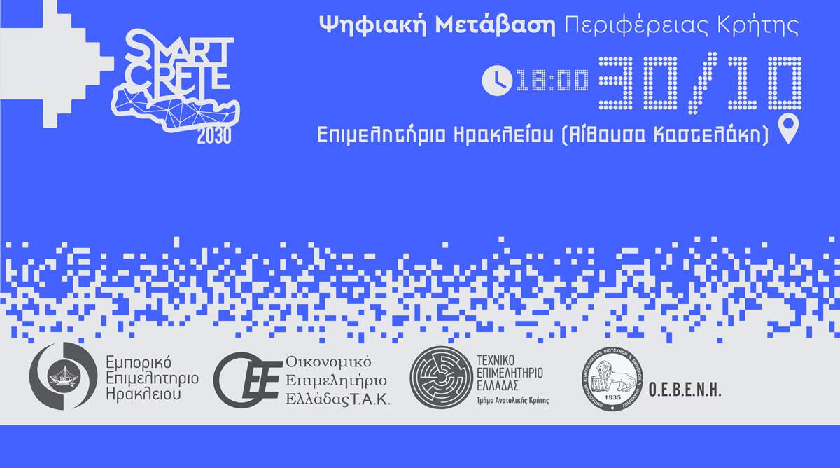 Η Περιφέρεια Κρήτης διοργανώνει ενημερωτική εκδήλωση με θέμα «ψηφιακή μετάβαση Περιφέρειας Κρήτης – Έξυπνη Κρήτη 2030», με τη συνεργασία του Εμπορικού Επιμελητηρίου Ηρακλείου, του Τμήματος Ανατολικής Κρήτης του Οικονομικού Επιμελητηρίου, του Τμήματος Ανατολικής Κρήτης του Τεχνικού Επιμελητηρίου και της Ομοσπονδίας Επαγγελματιών Βιοτεχνών εμπόρων Νομού Ηρακλείου (ΟΕΒΕΝΗ).