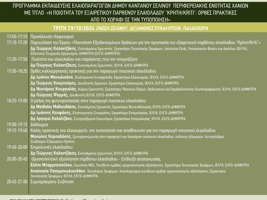 Η Περιφέρεια Κρήτης και ο Ελληνικός Γεωργικός Οργανισμός-ΔΗΜΗΤΡΑ (ΕΛΓΟ-ΔΗΜΗΤΡΑ), σε συνεργασία με το Δήμο Καντάνου Σελίνου, διοργανώνουν εσπερίδα για την ποιότητα του Εξαιρετικού Παρθένου Ελαιόλαδου “Κρήτη/Kriti”, η οποία θα πραγματοποιηθεί την Τρίτη 29 Οκτωβρίου 2024 στις 17:00 μ.μ στην Ένωση Σελίνου, στις Δεξαμενές Ευκαλύπτων στην Παλαιόχωρα. Την εκδήλωση υποστηρίζουν οι: Σύνδεσμος Εξαγωγέων Κρήτης, Σύνδεσμος Τυποποιητών Ελαιολάδου Κρήτης, Σύνδεσμος Ελαιοκομικών Δήμων Κρήτης, Δίκτυο Κρητικού Ελαιολάδου και ο Σύλλογος Ιδιοκτητών Ελαιουργείων Ν. Χανίων.