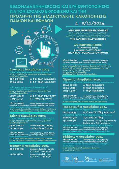 Η Περιφέρεια Κρήτης-Αυτοτελές Γραφείο Ισότητας των Φύλων, στο πλαίσιο του «Περιφερειακού Σχεδίου Δράσης Κρήτης για την Ισότητα των Φύλων 2023-2025», συνεχίζουν τη συνεργασία τους με τη Διεύθυνση Δίωξης Ηλεκτρονικού Εγκλήματος της Ελληνικής Αστυνομίας, πραγματοποιώντας τον 5ο Κύκλο Ενημερωτικών Δράσεων για την «Ασφαλή Πλοήγηση στο Διαδίκτυο, τους Διαδικτυακούς Κινδύνους και τις Πρακτικές Αντιμετώπισής τους», από τη Δευτέρα 4 Νοεμβρίου έως και το Σάββατο 9 Νοεμβρίου 2024, με σκοπό την πρόληψη και αντιμετώπιση του σχολικού εκφοβισμού και της διαδικτυακής παρενόχλησης και κακοποίησης παιδιών και εφήβων.