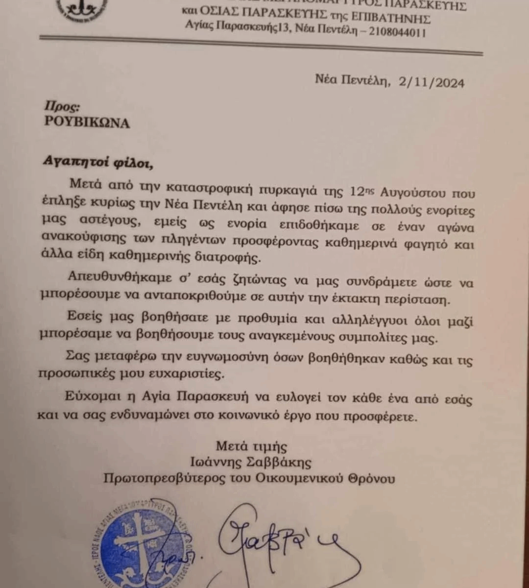 «Να σας ευλογεί η Αγία Παρασκευή» γράφει στην επιστολή του ο πρωτοπρεσβύτερος Ιωάννης Σαββάκης για την βοήθεια των μελών του Ρουβίκωνα μετά τη φωτιά της 12ης Αυγούστου.
