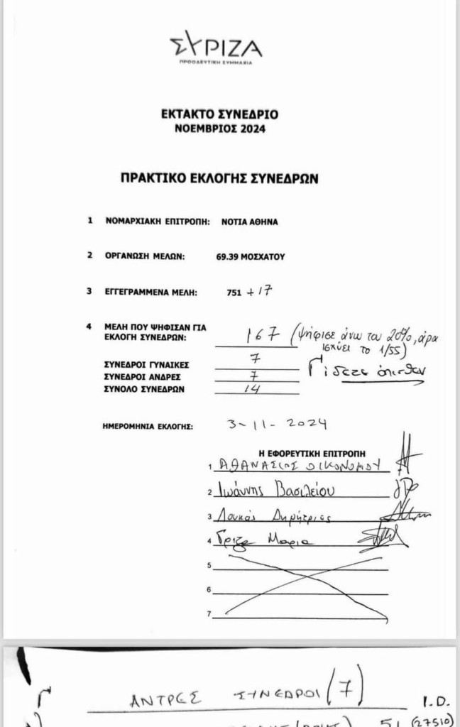 Σύμφωνα με τα πρακτικά, η Οργάνωση Μελών Μοσχάτου εξέλεξε 14 σύνεδρους (7 γυναίκες και 7 άντρες). Σε αυτά δεν υπάρχει το όνομα της Πέρσας Πολάκη. Δεν είχε συγκεντρώσει τον απαιτούμενο αριθμό ψήφων.