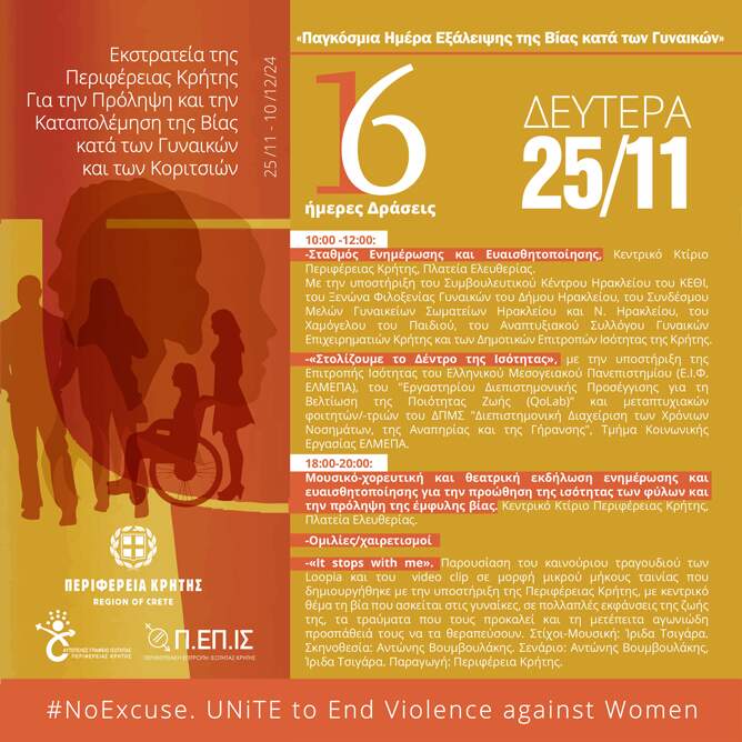 Η Περιφέρεια Κρήτης, η Περιφερειακή Επιτροπή Ισότητας των Φύλων Κρήτης (Π.ΕΠ.ΙΣ. Κρήτης) και το Αυτοτελές Γραφείο Ισότητας, πραγματοποιούν για πέμπτη συνεχόμενη χρονιά, σε συμπόρευση με τον Οργανισμό Ηνωμένων Εθνών, την Εκστρατεία ενημέρωσης, προβληματισμού και ευαισθητοποίησης, με τίτλο: «16ήμερες Δράσεις για την Πρόληψη και την Καταπολέμηση της Βίας κατά των Γυναικών και των Κοριτσιών», από τις 25 Νοεμβρίου 2024 «Παγκόσμια Ημέρα Εξάλειψης της Βίας κατά των Γυναικών», έως τις 10 Δεκεμβρίου 2024, «Παγκόσμια Ημέρα Ανθρωπίνων Δικαιωμάτων».