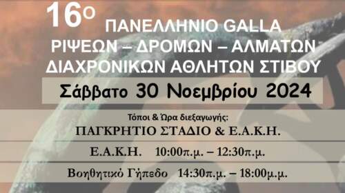 Η Παγκρήτια Ένωση Διαχρονικών Αθλητών Στίβου «ΠΕΔΑΣ ΜΙΝΩΣ» με την υποστήριξη της Περιφέρειας Κρήτης , της ΕΑΣ ΣΕΓΑΣ ΚΡΗΤΗΣ , του Τμήματος Αθλητισμού του Δήμου Ηρακλείου και την Ομοσπονδία Ελλήνων Βετεράνων Αθλητών Στίβου συνδιοργανώνει με τη Γ.Ε. Ηρακλείου το 16ο Πανελλήνιο GALA Ρίψεων – Δρόμων – Αλμάτων που θα διεξαχθεί το Σάββατο 30.11.2024 στο Ηράκλειο. Τα αγωνίσματα θα διεξαχθούν…