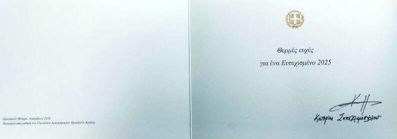 “Η ευχετήρια κάρτα με τη ζωγραφιά του μαθητή Γιώργου Σφακιανακη από το Αρκαλοχώρι που φέρει την υπογραφή της Προέδρου της Δημοκρατίας, αποτελεί μία συμβολική αλλά και ουσιαστική κίνηση από μέρους της κ. Σακελλαροπούλου, για την σεισμόπληκτη περιοχή και τους μαθητές εκείνους που από τον σεισμό μέχρι και σήμερα, κάνουν μάθημα σε οικίσκους αφού τα σχολεία τους έχουν κριθεί ακατάλληλα. Η κ. Σακελλαροπούλου έχει αποδείξει έμπρακτα το ενδιαφέρον της για τον τόπο μας και γνωρίζουμε την ευαισθησία της για τα παιδιά αλλά τα προβλήματα που αντιμετωπίζουμε μετά τον σεισμό. Ως Δημοτική Αρχή προχωρούμε τις διαδικασίες για να κερδίσουμε το χαμένο έδαφος ώστε οι μαθητές μας να επιστρέψουν το συντομότερο δυνατό, στις σχολικές αίθουσες που τους αξίζουν. Συγχαρητήρια στον Γιώργο που μας συγκίνησε με το ταλέντο του και μας έκανε όλους υπερήφανους. Έχουμε ανάγκη να βλέπουμε παιδιά που δεν το βάζουν κάτω και μας εκπλήσσουν με τις ικανότητες τους» δήλωσε ο Δήμαρχος Μινώα Πεδιάδας Βασίλης Κεγκέρογλου.