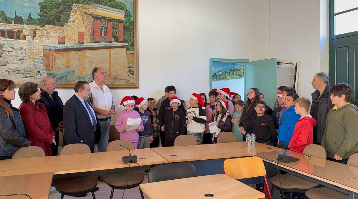 Με χαρούμενες φωνές και χριστουγεννιάτικες μελωδίες γέμισε το πρωί, το Δημοτικό Κατάστημα Καστελλίου του Δήμου Μινώα Πεδιάδας, όπου μαθητές της Ε’ και ΣΤ’ Τάξης του Δημοτικού Σχολείου αλλά και της Γ’ Λυκείου Καστελλίου, έψαλαν τα κάλαντα στον Δήμαρχο Βασίλη Κεγκέρογλου και στο προσωπικού του Δήμου, παρουσία του Προέδρου του Δημοτικού Συμβουλίου και Διευθυντή του Δημοτικού Σχολείου Καστελλίου Γιώργου Καλογεράκη, των Αντιδημάρχων Μανώλη Κουρλετάκη και Καλλιόπης Αποστολογιωργάκη αλλά και της Προέδρου της Δημοτικής Κοινότητας Καστελλίου, Μαρίας Σκουλούδη.