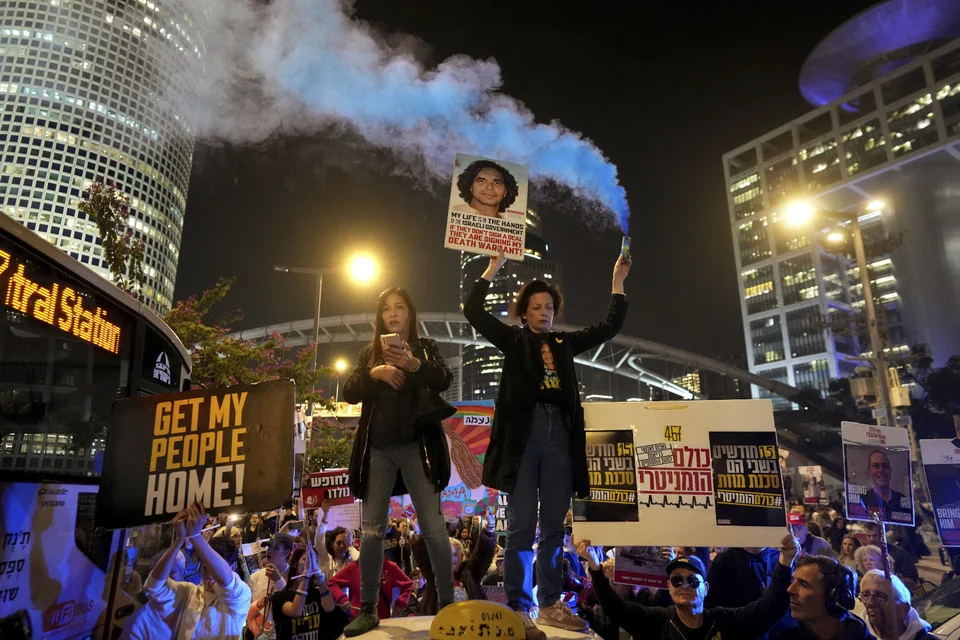 Συγγενείς και φίλοι ύψωσαν ξανά πανό διαμαρτυρίας στην «πλατεία των ομήρων» στο Τελ Αβίβ, με τα πρόσωπα των αγαπημένων τους που απήχθησαν πριν από 466 ημέρες από τη Χαμάς.