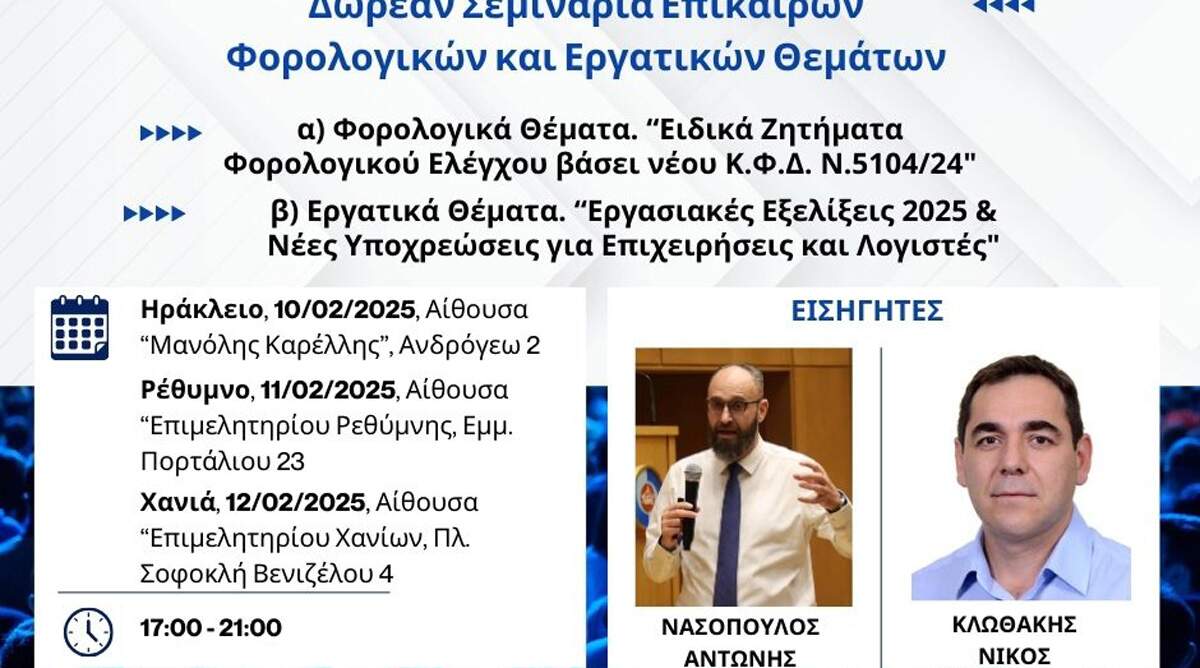 Δωρεάν σεμινάρια Φορολογικών & Εργατικών θεμάτων σε Ηράκλειο, Ρέθυμνο και Χανιά