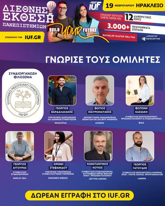 Tο Ελληνικό Μεσογειακό Πανεπιστήμιο (ΕΛΜΕΠΑ), θέλοντας να στηρίξει τον επαγγελματικό προσανατολισμό και την επαγγελματική ανάπτυξη των νέων, συνδιοργανώνει και φιλοξενεί τη Διεθνή Έκθεση Πανεπιστημίων (International University Fair, IUF) που έρχεται για δεύτερη φορά στο Ηράκλειο της Κρήτης, την Τετάρτη 19 Φεβρουαρίου 2025, 14:00 – 19:00, στο κτήριο της Σχολής Επιστημών Υγείας (ΣΕΥ). Η IUF αποτελεί το μεγαλύτερο εκπαιδευτικό γεγονός στη Νοτιοανατολική Ευρώπη και πραγματοποιείται φέτος, για 12η φορά στην Ελλάδα.