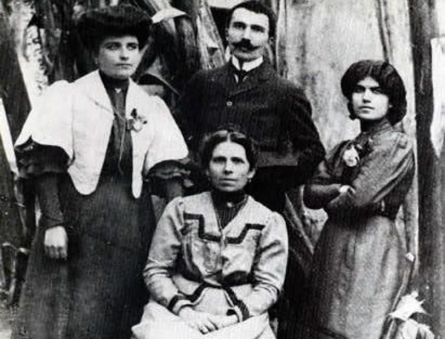 Στα 1900, όρθιοι, από αριστερά: Ο Νίκος Καζαντζάκης και οι αδελφές του Αναστασία και Ελένη. (Καθήμενοι:) Ο αδελφός της μητέρας του, Αντώνης Χριστοδουλάκης και η μητέρα του Μαρία. (Καθήμενοι μπροστά:) Τα εξαδέλφια του Άννα και Γεώργιος, τέκνα του Αντώνη Χριστοδουλάκη – Φωτογραφίες: Εκδόσεις Καζαντζάκη