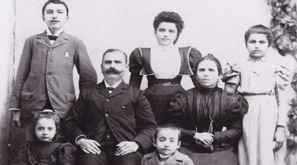 Στα 1900, όρθιοι, από αριστερά: Ο Νίκος Καζαντζάκης και οι αδελφές του Αναστασία και Ελένη. (Καθήμενοι:) Ο αδελφός της μητέρας του, Αντώνης Χριστοδουλάκης και η μητέρα του Μαρία. (Καθήμενοι μπροστά:) Τα εξαδέλφια του Άννα και Γεώργιος, τέκνα του Αντώνη Χριστοδουλάκη – Φωτογραφίες: Εκδόσεις Καζαντζάκη