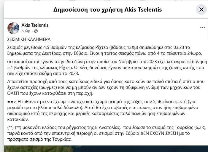 Νωρίτερα είχε μιλήσει για το μπαράζ σεισμών στην Εύβοια ο καθηγητής Γεωλογίας και πρόεδρος του ΟΑΣΠ Ευθύμης Λέκκας. «Όπως είχα τονίσει από την αρχή θα είχαμε τέτοιους σεισμούς της τάξεως των 4 και 5 Ρίχτερ για τις επόμενες ημέρες. Αυτό το λέμε γιατί την ίδια εικόνα είχαμε και στις προηγούμενες σεισμικές διεγέρσεις» δήλωσε στην ΕΡΤ.