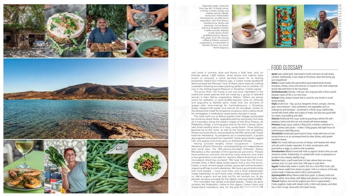 Το 14σέλιδο αφιέρωμα προσκαλεί τους αναγνώστες να “ανακαλύψουν τις γεύσεις, παραδόσεις και το συναρπαστικό τοπίο της ανατολικής Κρήτης, όπου η ιστορία και η φιλοξενία συνυπάρχουν. Μέσα από πλούσιο φωτογραφικό υλικό και λεπτομερή κείμενα, το αφιέρωμα αναδεικνύει την αυθεντικότητα της κρητικής γαστρονομίας, τα ποιοτικά τοπικά προϊόντα της Περιφερειακής Ενότητας Λασιθίου, τις παραδοσιακές συνταγές και τα έθιμα που συνδέονται με την κρητική διατροφή. Περιλαμβάνει επίσης πρακτικές πληροφορίες και ένα χρήσιμο γλωσσάρι γαστρονομικών όρων της Κρήτης.