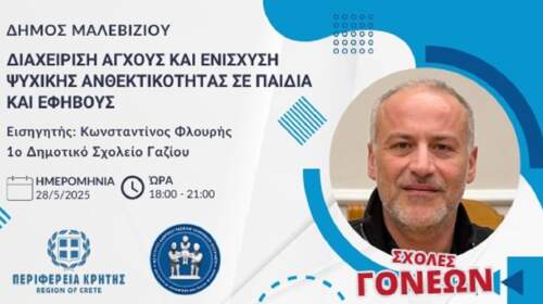 Με θέμα «Διαχείριση άγχους και ενίσχυση ψυχικής ανθεκτικότητας σε παιδιά και εφήβους» Συνεχίζονται οι Σχολές Γονέων της Περιφέρειας Κρήτης, σε συνεργασία με το Ινστιτούτο Ανθρωπιστικών και Κοινωνικών Επιστημών (ΙΑΚΕ) και την υποστήριξη του Δήμου Μαλεβιζίου. Η προσεχής συνάντηση με θέμα: «Διαχείριση άγχους και ενίσχυση ψυχικής ανθεκτικότητας σε παιδιά και εφήβους» θα πραγματοποιηθεί την Τετάρτη 28 Μαΐου 2025 στο 1ο Δημοτικό Σχολείο Γαζίου και ώρα 18:00-21:00.…