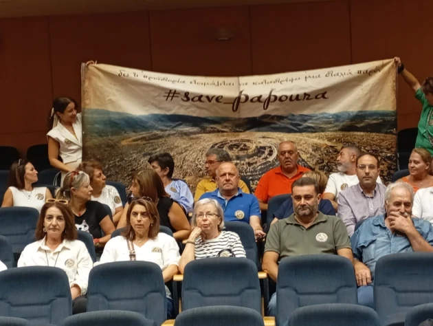 Με πανό που έγραφε «save Papoura», κάτοικοι, φορείς και εκπρόσωποι της τοπικής αυτοδιοίκησης παρενέβησαν συμβολικά σήμερα στο Επιμελητήριο Ηρακλείου, κατά τη διάρκεια ημερίδας του Υπουργείου Πολιτισμού, στέλνοντας ξεκάθαρο μήνυμα υπέρ της διάσωσης του λόφου Παπούρα.