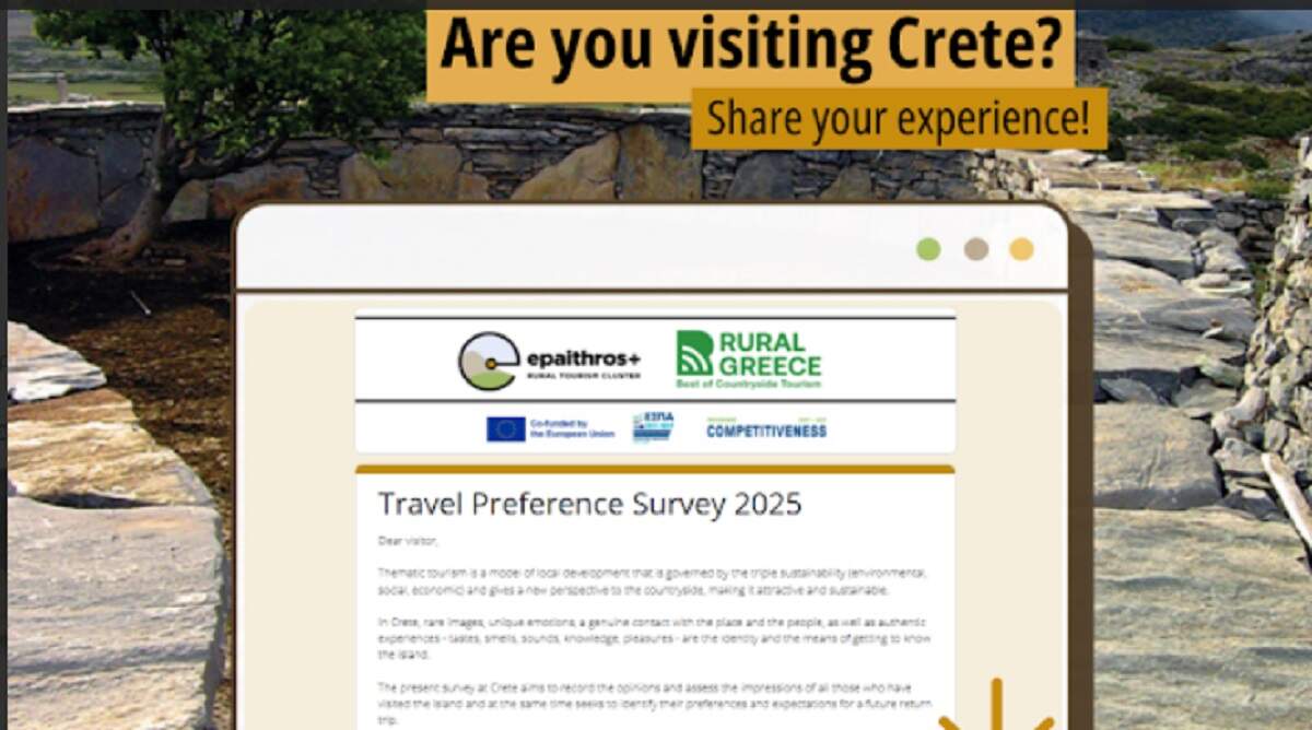 Το Δίκτυο Τουρισμού Υπαίθρου epaithros+, θέλει να γνωρίσει καλύτερα τους ταξιδιώτες της Κρήτης και τις εμπειρίες που αναζητούν! Στο πλαίσιο αυτό πραγματοποιεί για ακόμη μία χρονιά πρωτογενή έρευνα διερεύνησης των προτιμήσεών τους, μετά την παραμονή τους στο νησί.