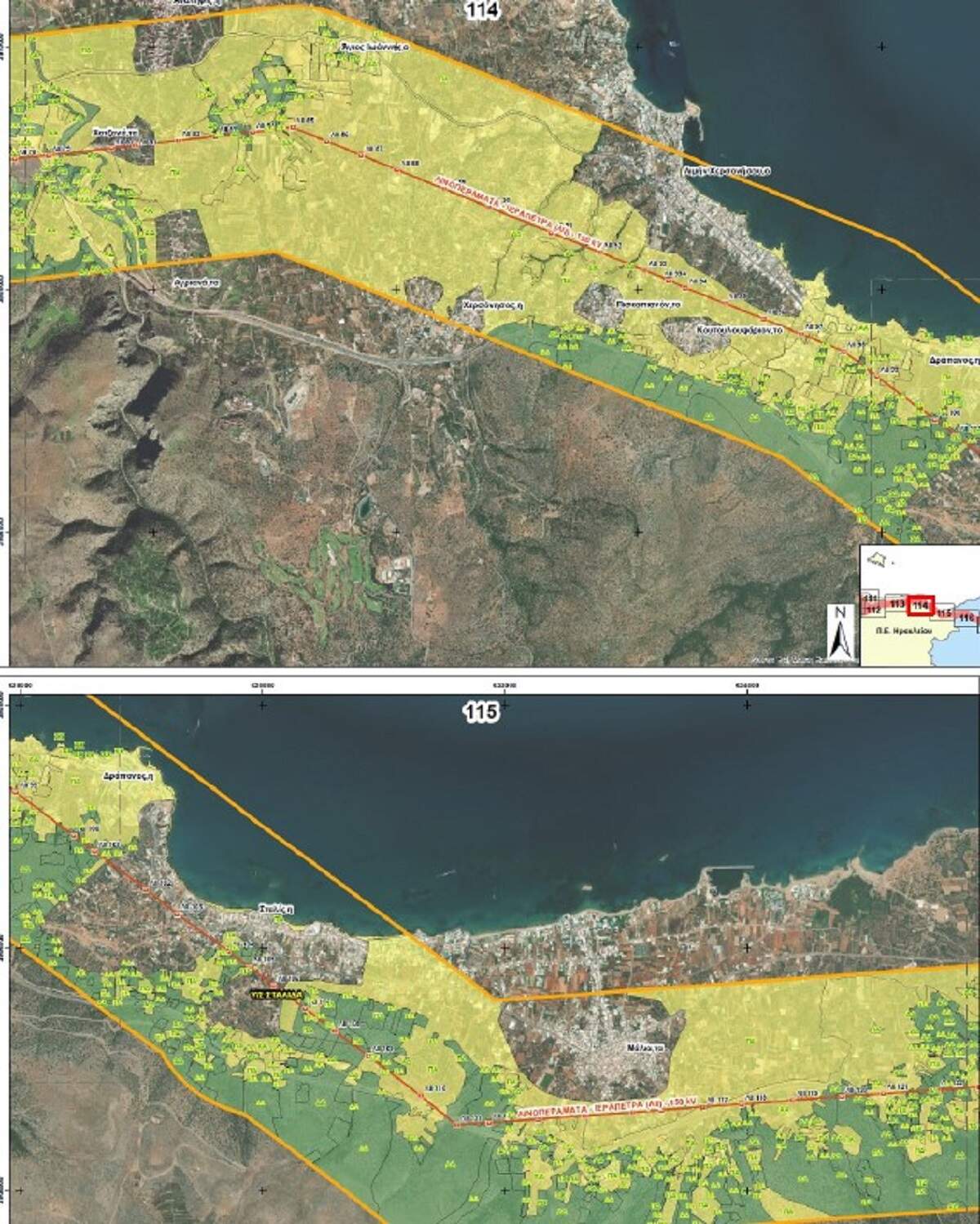 ⦁ Το υφιστάμενο δίκτυο υψηλής τάσης διέρχεται από περιοχές με πολύ μεγάλη οικιστική ανάπτυξη, όπως οι οικισμοί «Λιμένα Χερσονήσου», «Πισκοπιανό», «Κουτουλουφάρι», ακριβώς πάνω από το σχέδιο πόλης Σταλίδας, όπου λειτουργεί υποσταθμός εντός των ορίων του σχεδίου, και νότια του οικισμού Μαλίων σε απόσταση μικρότερη των 100μ.