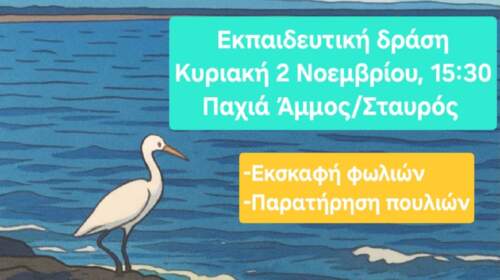 Ο Σύλλογος Προστασίας Περιβάλλοντος Σταυρού (SEA), σε συνεργασία με το Μουσείο Φυσικής Ιστορίας Κρήτης, διοργανώνει μια ξεχωριστή εκπαιδευτική δράση την Κυριακή 2 Νοεμβρίου 2025, στις 15:30 μ.μ., στην Παχιά Άμμο στον Σταυρό Ακρωτηρίου. Η δράση περιλαμβάνει εκσκαφή φωλιών της θαλάσσιας χελώνας Caretta caretta, μέσα από την οποία μικροί και μεγάλοι θα έχουν την ευκαιρία να γνωρίσουν τον μαγευτικό κύκλο ζωής αυτού του απειλούμενου είδους και τη σημασία…