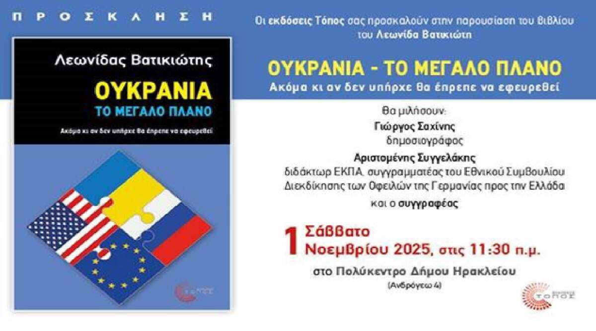 Διπλή παρουσίαση του βιβλίου «Ουκρανία – το μεγάλο πλάνο» (εκδ. Τόπος) του Λεωνίδα Βατικιώτη στην Κρήτη, στα Χανιά και το Ηράκλειο.