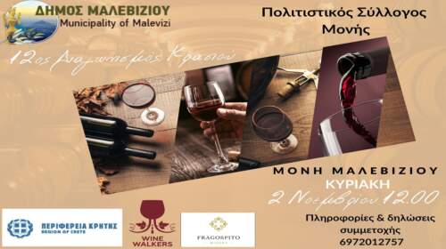 Στις 12.00 το μεσημέρι της Κυριακής θα ξεκινήσει ο 12ος Διαγωνισμός Κρασιού στη Μονή Μαλεβιζίου στην αίθουσα του Πολιτιστικού Συλλόγου. Ο διαγωνισμός διοργανώνεται από τον Πολιτιστικό Σύλλογο Μονής σε συνεργασία με το Δήμο Μαλεβιζίου και την Περιφέρεια Κρήτης. Ο διαγωνισμός, που έχει πλέον καθιερωθεί ως θεσμός για την περιοχή, αποτελεί μια γιορτή του κρασιού, της παράδοσης και της τοπικής γαστρονομίας,…