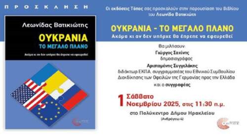 Διπλή παρουσίαση του βιβλίου «Ουκρανία – το μεγάλο πλάνο» (εκδ. Τόπος) του Λεωνίδα Βατικιώτη στην Κρήτη, στα Χανιά και το Ηράκλειο. Στο Ηράκλειο, η παρουσίαση θα γίνει το Σάββατο 1 Νοεμβρίου 2025, στις 11:30 π.μ. στο Πολύκεντρο Δήμου Ηρακλείου (Ανδρόγεω 4). Θα μιλήσουν: Στα Χανιά η παρουσίαση θα γίνει απόψε, Παρασκευή 31 Οκτωβρίου 2025, στις 8 μ.μ. στο ιστορικό καφέ Κήπος, στον Δημοτικό Κήπο Χανίων. Θα…