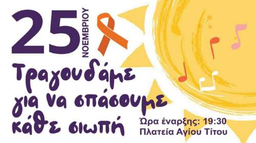 Ο «Σύνδεσμος Μελών Γυναικείων Σωματείων Ηρακλείου και Ν. Ηρακλείου»τιμά την 25η Νοεμβρίου Μέσα από τη δύναμη της μουσικής, που μπορεί να ενώσει τους ανθρώπους και να μεταδώσει μηνύματα πέρα από σύνορα και κάθε μορφής φραγμούς, ο «Σύνδεσμος Μελών Γυναικείων Σωματείων Ηρακλείου και Ν. Ηρακλείου» επιδιώκει να στείλει ένα ηχηρό μήνυμα με αφορμή τη Διεθνή Ημέρα για την Εξάλειψη της Βίας…
