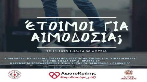 Σε αυτή την αιμοδοσία συμμετέχουν οι σπουδαστές της Σ.Α.Ε.Κ του Γ.Ν «Βενιζέλειο – Πανάνειο». Η εθελοντική αιμοδοσία πραγματοποιείται κάθε Σάββατο. Πρόκειται για μια κοινή προσπάθεια αιμοδοσίας, την οποία διοργανώνει ο Παγκρήτιος Σύνδεσμος Εθελοντών Αιμοδοτών και Δωρητών Οργάνων Σώματος «Αιματοκρήτης» με τη στήριξη του Δήμου Ηρακλείου. Σε αυτή την κοινή προσπάθεια, καλούνται όλοι να συμμετάσχουν. Η αιμοδοσία απευθύνεται σε όσους θέλουν…
